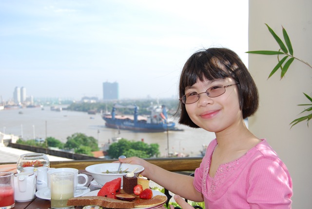 Me eating buffet breakfast on the hotel's balcony restaurant in the muggy Vietnamese weather, portrayed against the busy (and no doubt polluted) river.